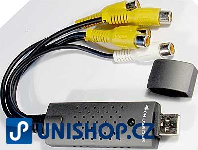 Převádí signál z 1–4 kamer + 1 zvuk do kompresního formátu H.264 v rozlišení 704×576, instalační software s obslužným programem, výstup USB 2.0, rozměry 60×20×100mm, napájení přes USB